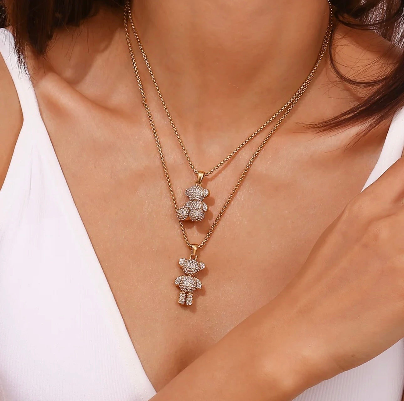 Cute Teddybear necklace, covered with beautiful zirconia stones. 18k gold plated, nickel free and waterproof. With proper care this necklace can last some years. This necklace is versatile goes well with most outfits. Currently we have the bear on the main picture.