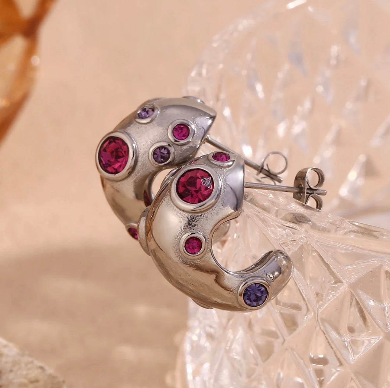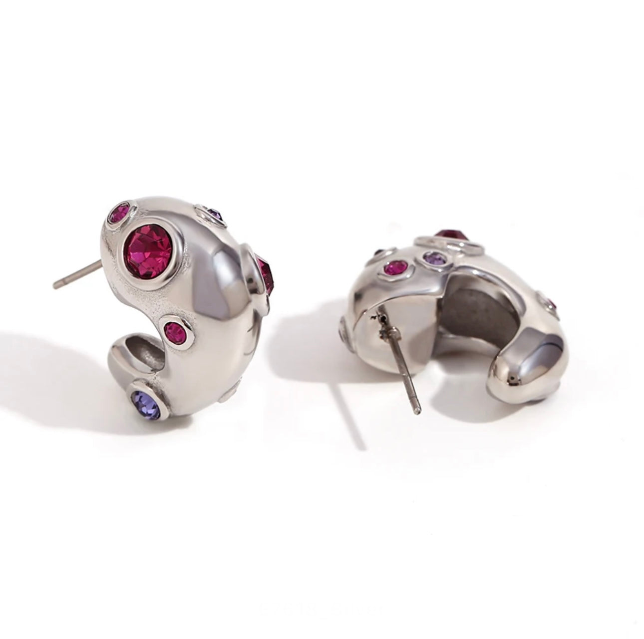 Colorful red Zirconia stones Bubble hoops ,a fun addition to your jewelry collection, suitable for casual wear or as everyday earrings, light weight and very comfortable. Currently available in Silver with red stones.